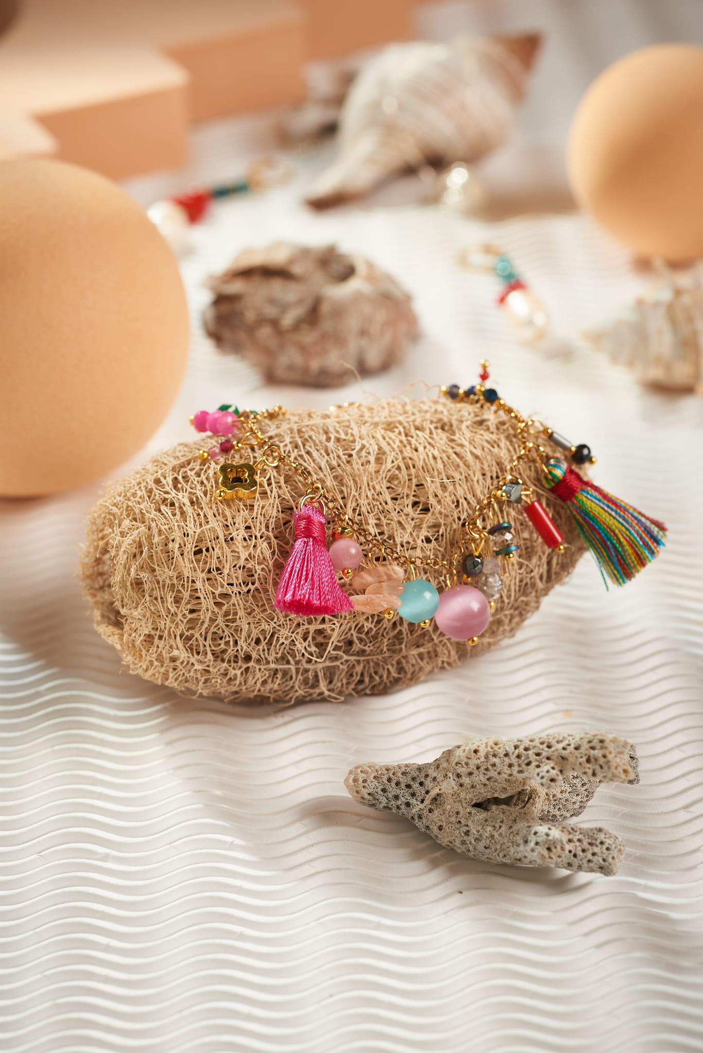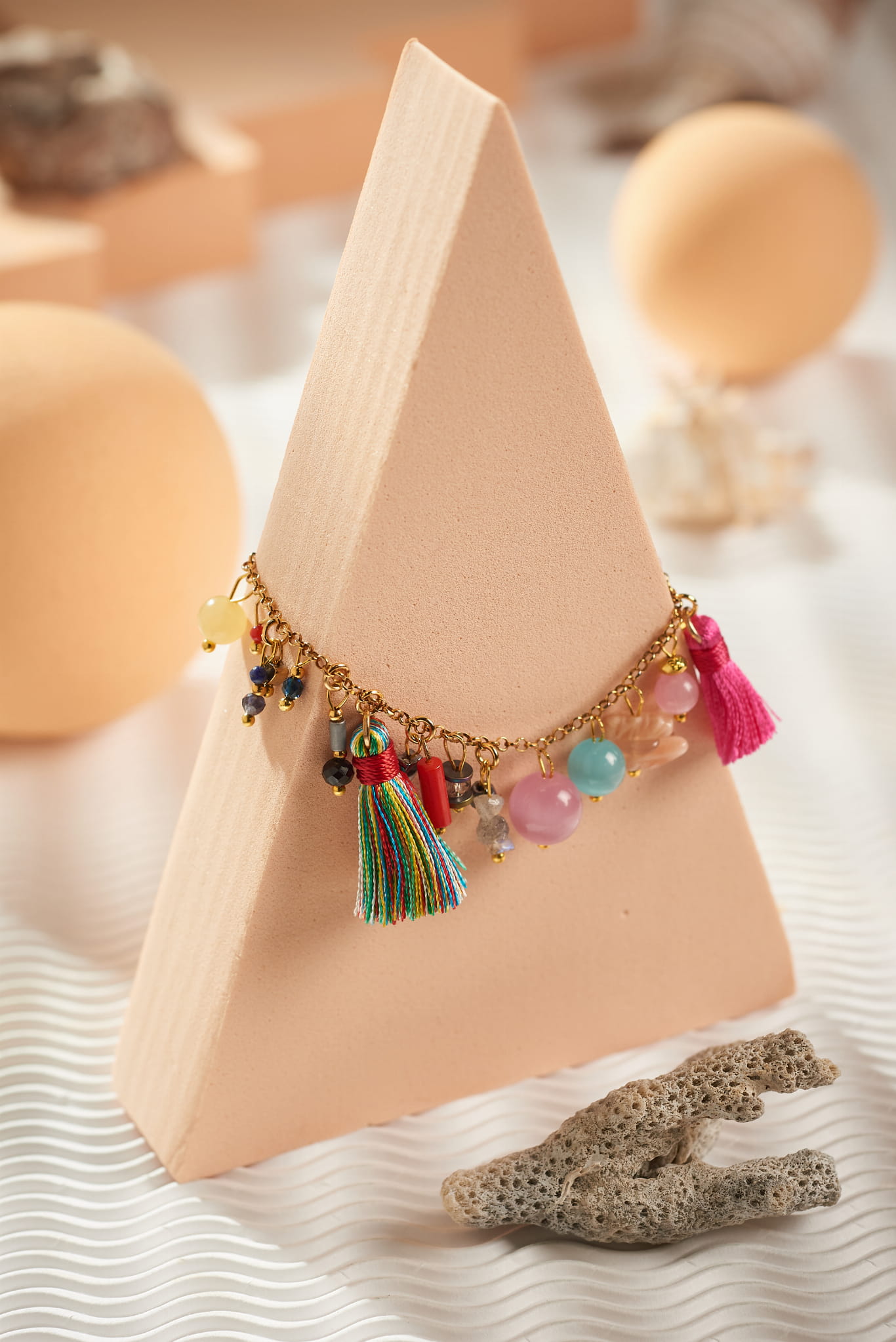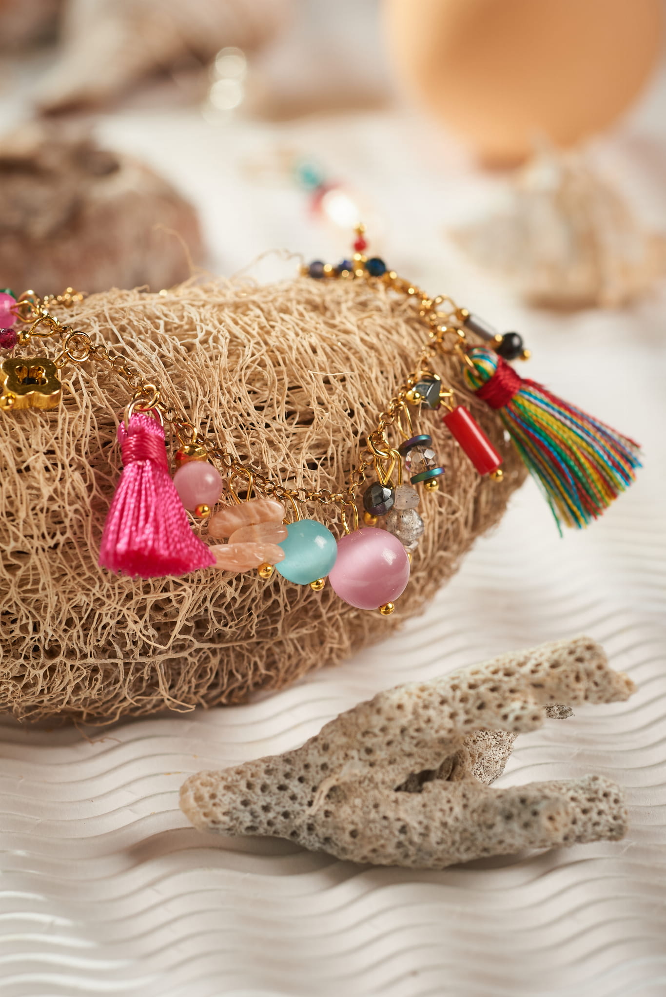 Na delikatnym złotym łańcuszku zawieszono mnóstwo kolorowych charmsów: kamienie naturalne, koraliki, frędzle - chwosty i mini zawieszki, które tworzą niepowtarzalną, wakacyjną kompozycję.