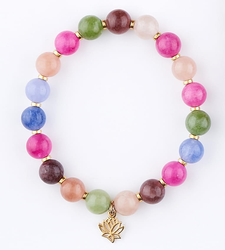 Ta kolorowa bransoletka z turmalinu łączy odcienie natury z delikatną zawieszką w kształcie kwiatu lilii.