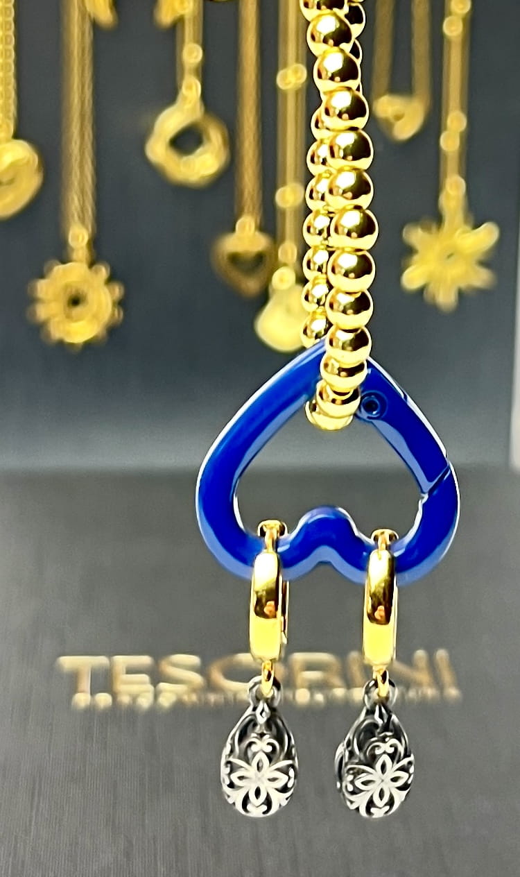 Bigle typu kajdanki w pozłacanej wersji srebra próby 0,925 z piękną ażurową zawieszką w kształcie kropli / łezki w wersji oksydowanej