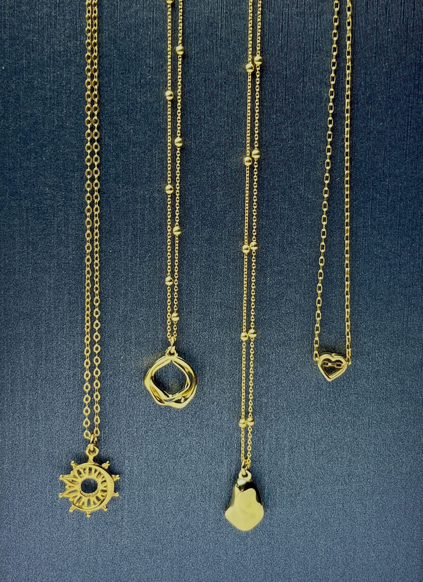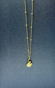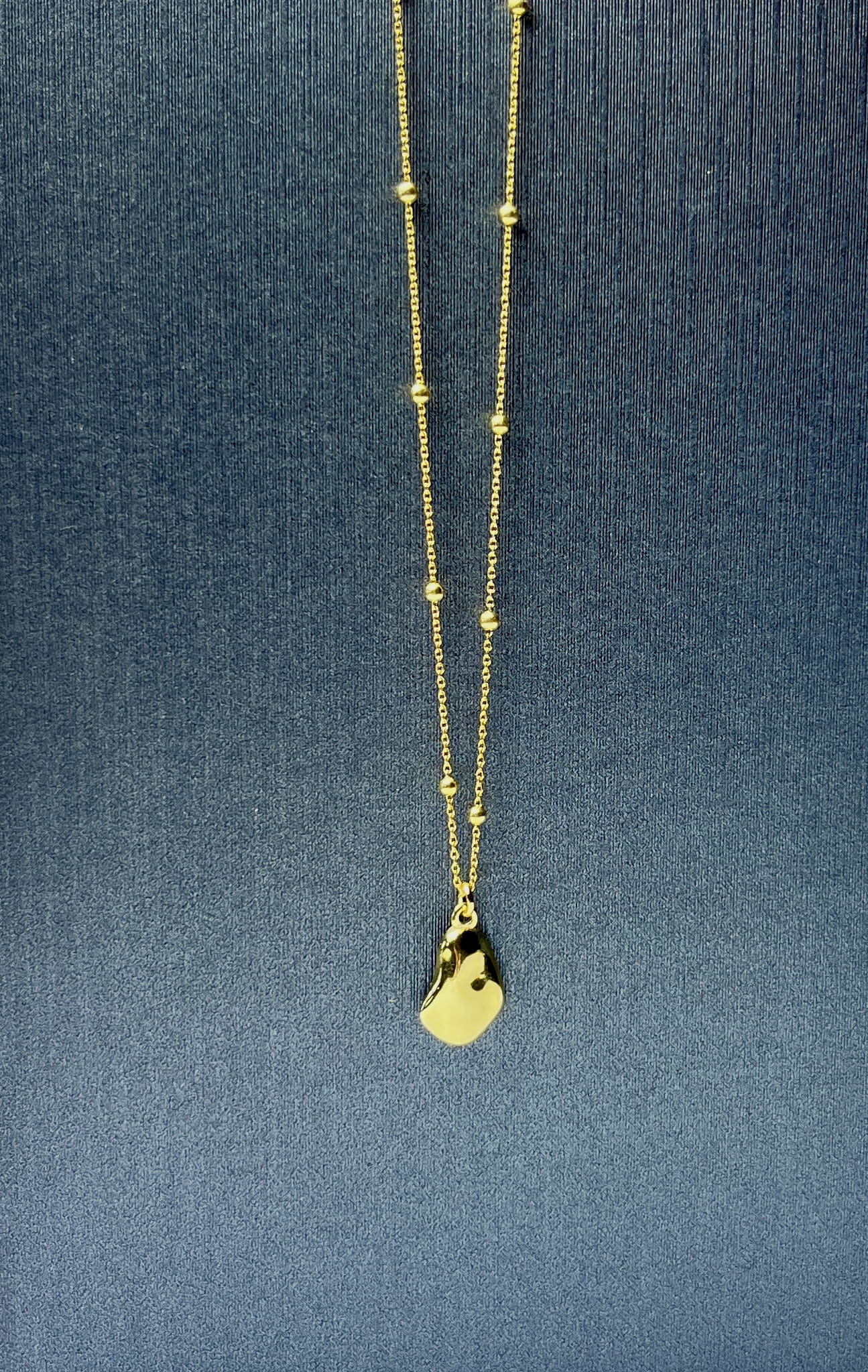 Piękny naszyjnik z pozłacanego łańcuszka kuleczkowego z zawieszką w nieregularnym, wypukłym kształcie.