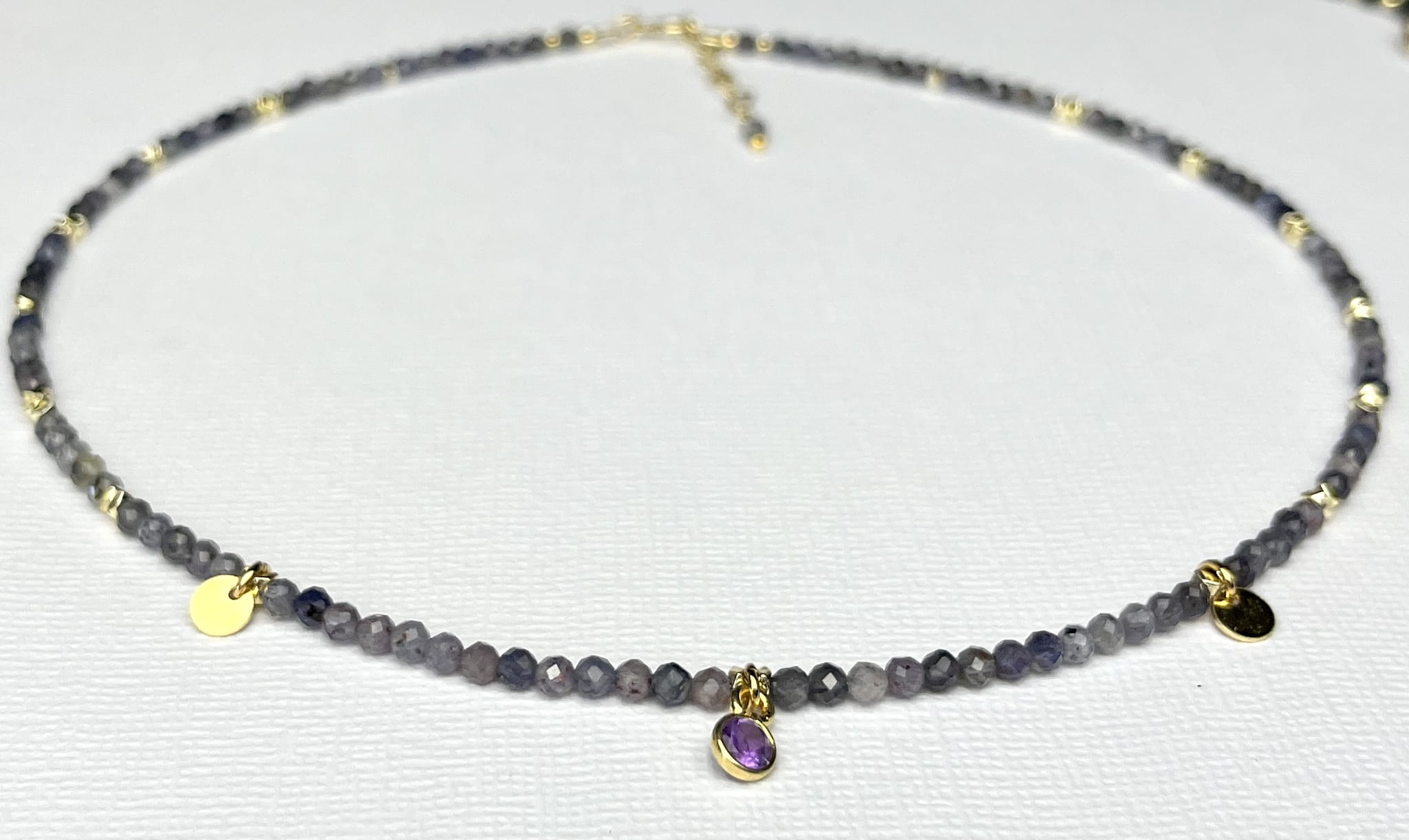 Naszyjnik typu choker z fasetowanych kamieni iolit w rozmiarze 2,5 mm z zawieszką z ametystu w okuciu ze srebra próby 0,925 w rozmiarze 4 mm i dwoma zawieszkami monetkami ze srebra próby 0,925 pozłacanymi w rozmiarze 4 mm, łańcuszek przedłużka w kształcie serduszek
