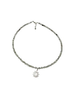 Krótki naszyjnik typu choker z zawieszką słońce i księżyc wykonany z kamieni księżycowych i srebra.