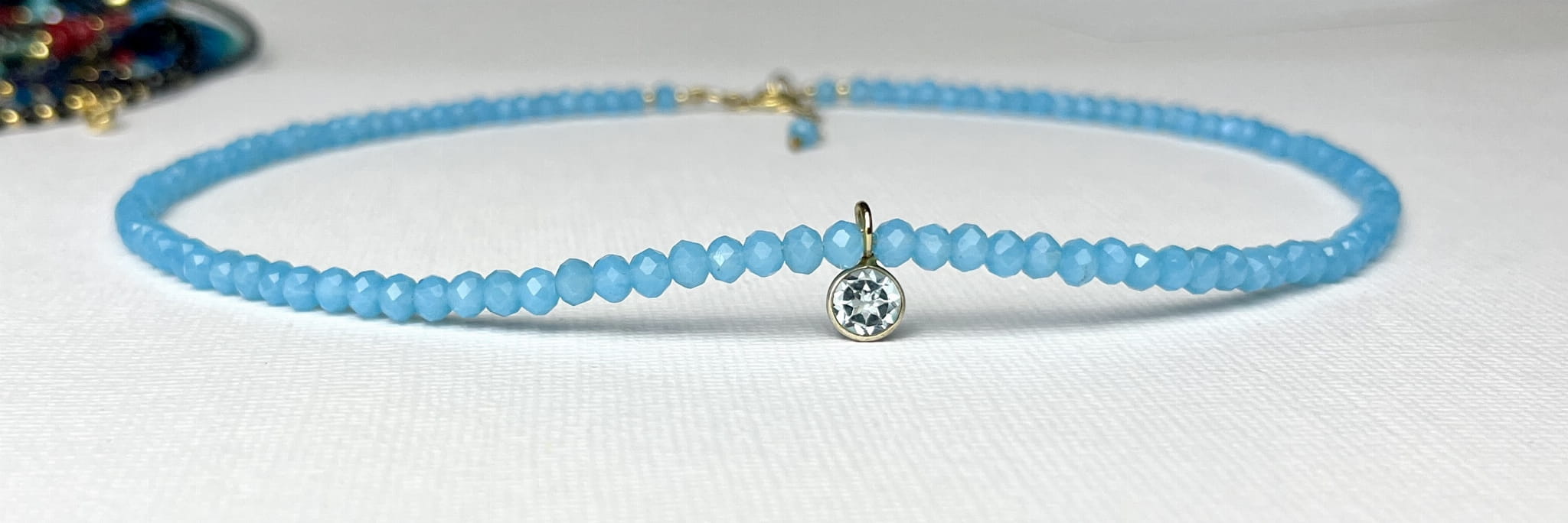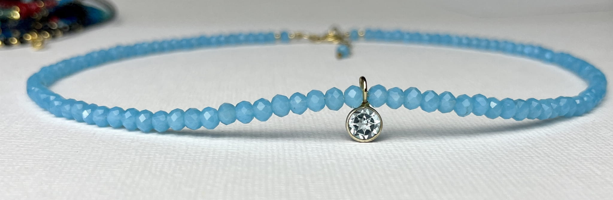 Naszyjnik typu choker w błękitnym kolorze z zawieszką z akwamarynu w okuciu.