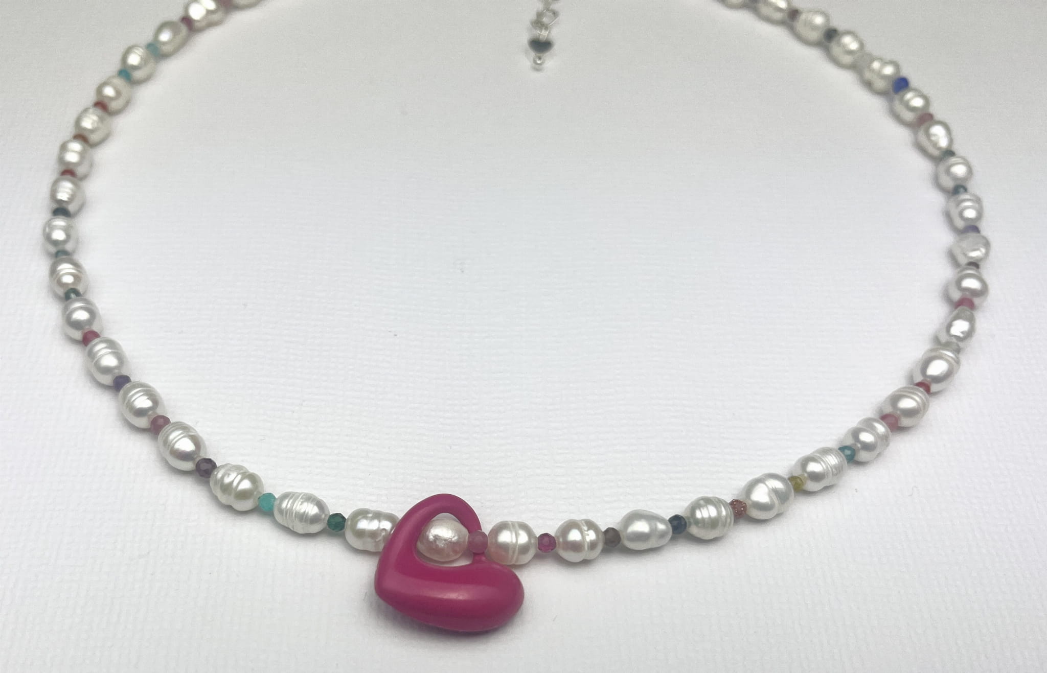 Niepowtarzalny naszyjnik typu choker z naturalnych pereł słodkowodnych o nieregularnych kształtach w towarzystwie miksu kamieni naturalnych - koral, amazonit, apatyt, hematyt, rodonit, granat, itd. - które stanowią przekładki pereł. Kompozycję dopełnia emaliowane, różowe serce.