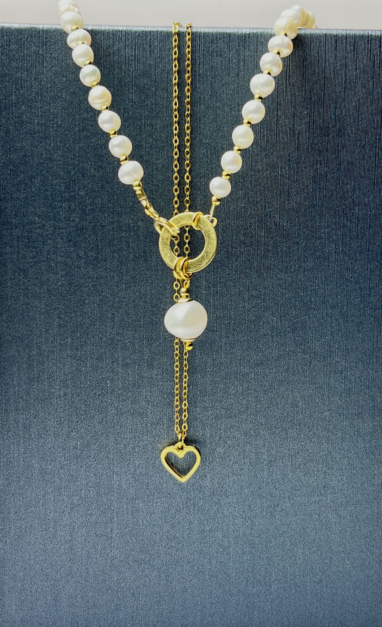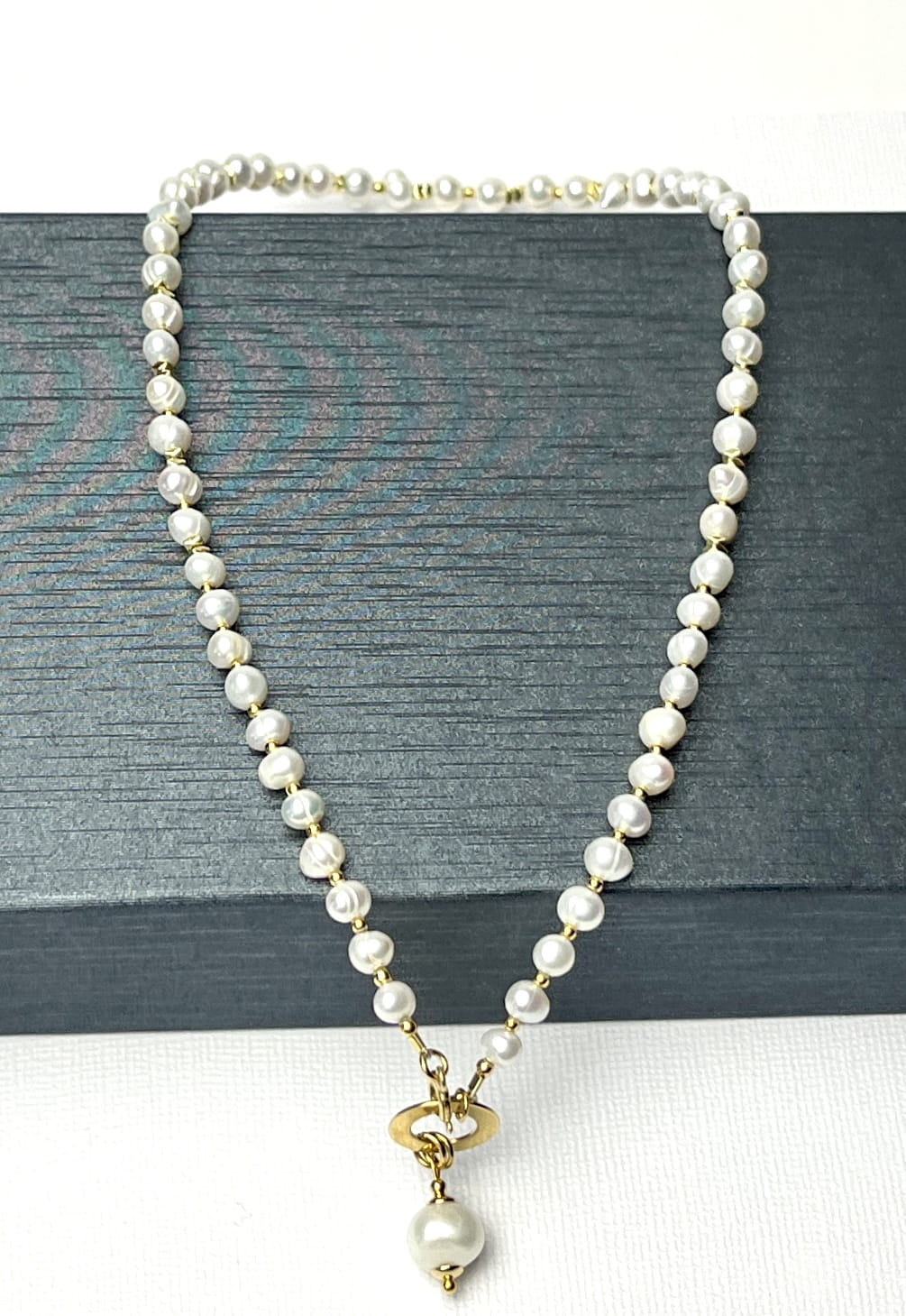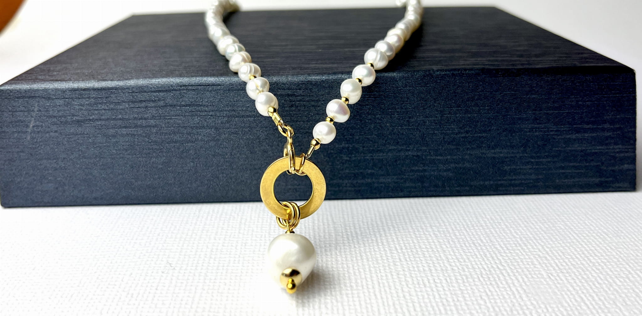 Ponadczasowy naszyjnik z nieregularnych pereł będzie znakomicie pasował do koszuli lub podkoszulka. Wyrazistym detalem naszyjnika jest zawieszka z większej perły umieszczona w centralnej części naszyjnika