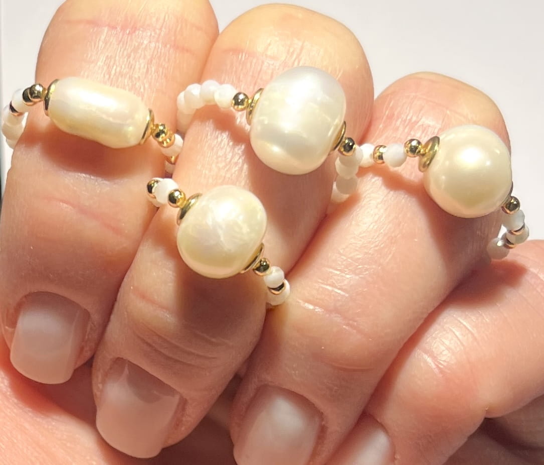 Pierścionek z białej muszli z dużą, naturalną, białą perłą w towarzystwie srebra pozłacanego próby 0,925Pięknie prezentuje się solo oraz w towarzystwie innych elastycznych pierścionków z kamieni naturalnych.